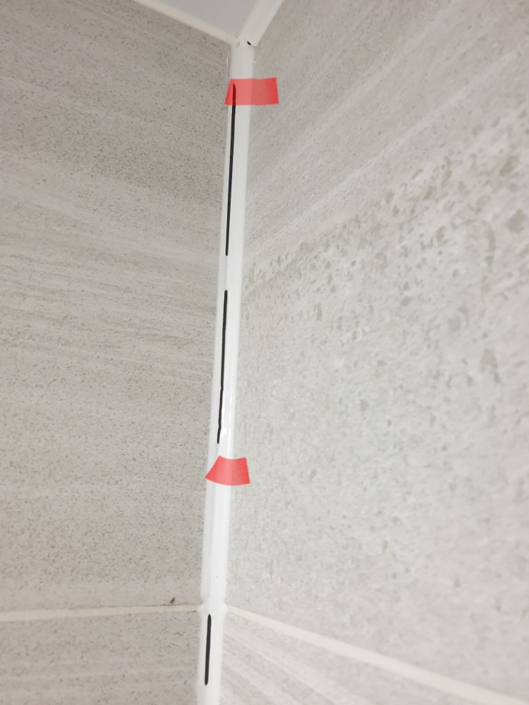 두 벽이 직교하는 구석 타일 표면 틈에 실링재를 주입했을 때, 상대적으로 배면이 넓고 받침이 없는 상태에서 실링재가 적정한 두께 유지를 할 수 없기 때문에 얇게 형성된 구석 줄눈이 바탕과 타일 등 부재 신축(여기서는 수축)시 실링재가 파단된 것으로 여겨집니다.