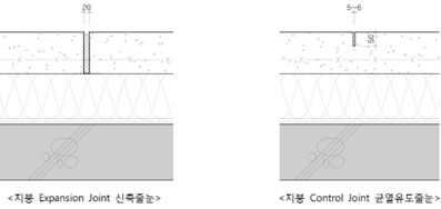 옥상 바닥 면적이 1,000m2라고 했는데, 이를, 정사각형이라고 가정했을 때 한 변의 길이는 약 31.6m정도입니다. 이정도 면적이라면 옥상에 작용하는 온도와 한 변의 길이 그리고 콘크리트의 선팽창계수 등을 고려했을 때, 신축줄눈을 세 곳 정도 설치하고 그 안을 폭이 3m 가깝게 saw cutting하는 것이 부재 응력에 의해 발생되는 균열을 제어하는데 적정했을 것으로 여겨집니다. 신축줄눈과 조절줄눈의 다름은 아래 첨부된 그림(국내 설계회사 자료 인용)을 참조하시기 바랍니다.