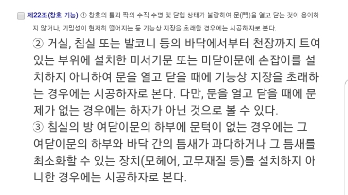 제22조(창호 기능) ① 창호의 틀과 짝의 수직·수평 및 닫힘 상태가 불량하여 문(門)을 열고 닫는 것이 용이하지 않거나, 기밀성이 현저히 떨어지는 등 기능상 지장을 초래할 경우에는 시공하자로 본다.