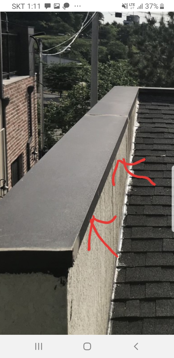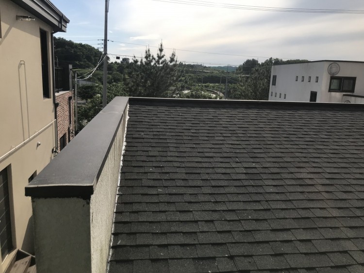 말씀하신 것처럼 아스팔트슁글과 벽이 만나는 부위에 누수가 가능은 하지만 경사도가 있어 새는 물의 양이 아주 소량이어야 합니다. 물이 고이지 않기 때문입니다.  사진상의 부분이 의심이 되신다면 천막같은걸로 막아놔 보시면 좀 더 정확히 판단하실 수 있을 것입니다^^