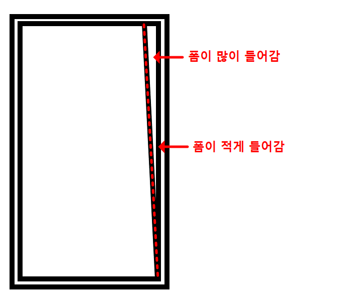 제가 궁금한 점은 문틀 시공 후 문을 넣으려고 하는데 사진과 같이 폼이 덜 쏴진 쪽의 폼의 숨이 죽으면서 문틀 사이즈가 바뀌었습니다.