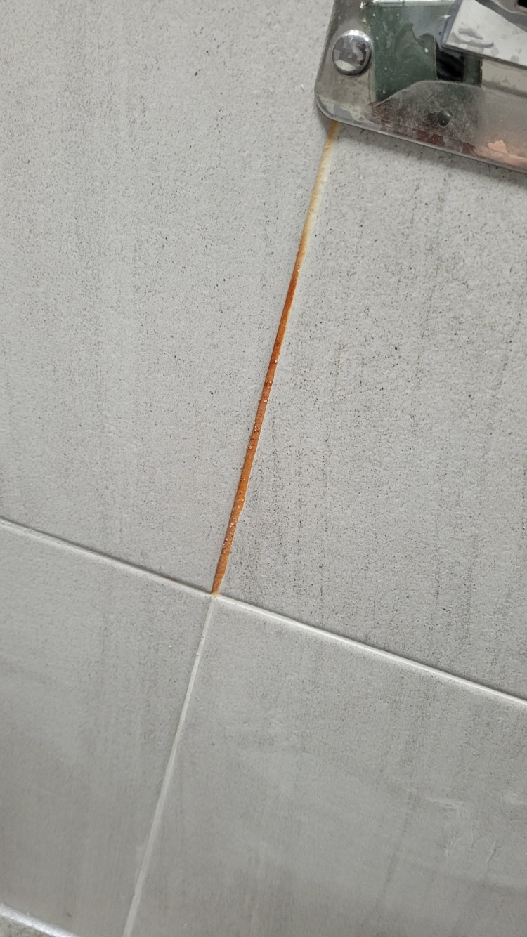 화장실 벽타일 하자 시공 후 사진과 같이 줄눈이 변색되기 시작했습니다. 특징은 첫날은 괜찮았는데 하루 뒤 점점 색이 올라오더니 3일째부턴 제법 찐해지고 위로 번져서 올라가는중.