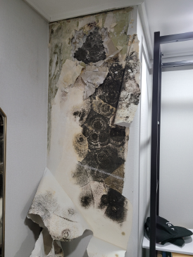 그런데 2021년 8월 초 부터 안방 화장실 앞 드레스룸 벽쪽에서 곰팡이가 조금씩 생기더니 점점 번져 갔습니다. 드레스룸쪽 벽쪽에서 생긴 곰팡이는 반대편 거실쪽 벽까지 피기 시작 하였고 곰팡이의 색도 점점 진해지고 검은색 곰팡이와 노란빛 곰팡이가 점점 번지기 시작하였습니다.