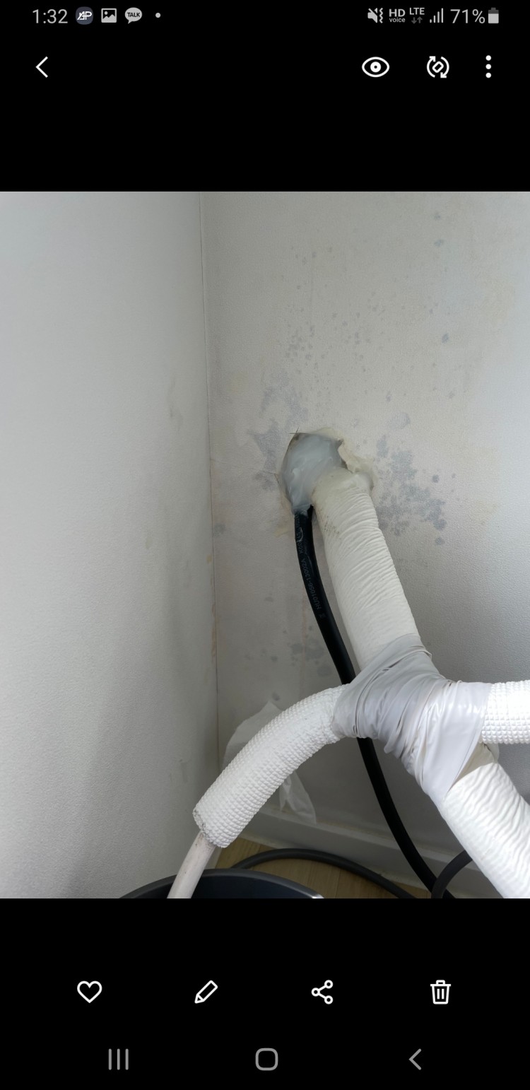 에어컨 설치당시 외부 코킹이 촘촘하지 못하게 되어있었는데 이후 드레인관을 이동하다가 코킹이 더 뜯어졌고 이를 인지하지 못한상태로 한 2주정도 사용을 했더니, 에어컨 배관 주변으로 곰팡이가 심하게 피었습니다. ( 최근에 비가 몇번 와서 그랬는지..)