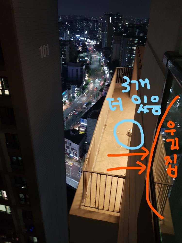단차가 있는 아파트라 옆 라인 옥상이 저희 집이랑 거의 맞닿아 있습니다.