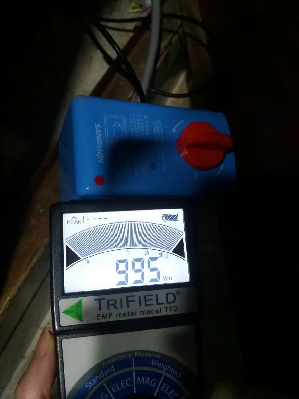 오늘 전자파측정기로 측정을 해보니까  구동기가 연결이 되어있네요 영상에 보이는  콘센트 뒷 쪽에 선이 구동기가 연결되어 있는 선이에요