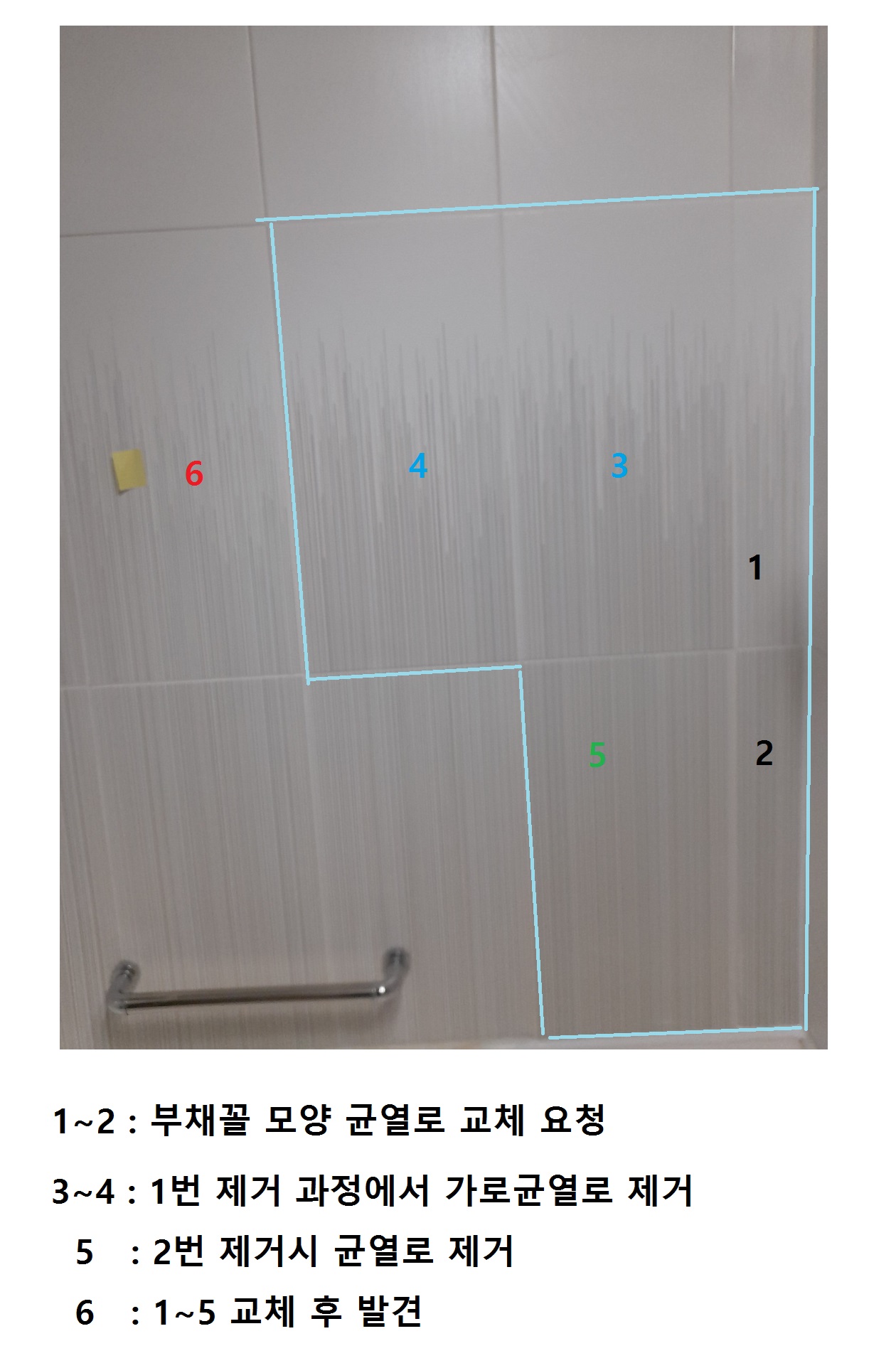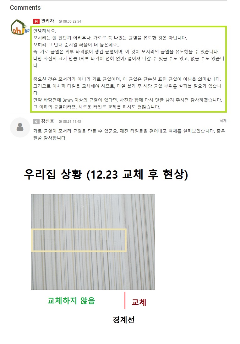 실리콘 냄새가 다 빠진 후 오늘 청소를 하려고 하였더니 그 옆에 교체하지 않은 타일에 균열이 보입니다. 안 벽체에 보이는  균열과 같은 선상에 있는 것으로 보이는데요....