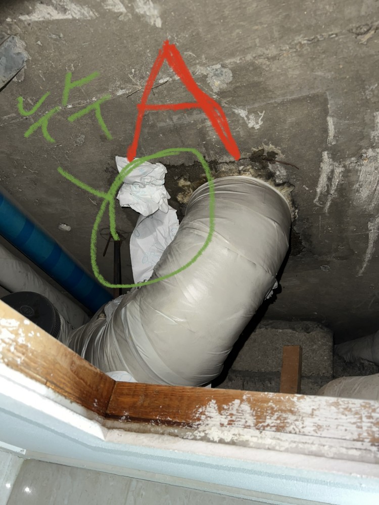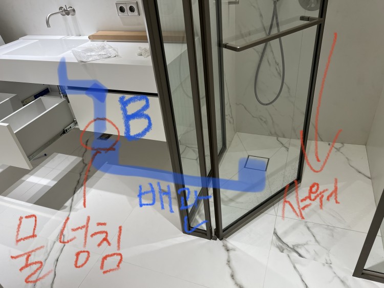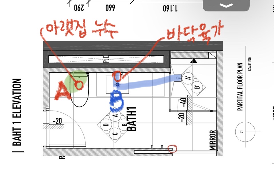 아파트 인테리어 현장이고, 현재 화장실에 두가지 문제가 있습니다. 아랫집에서 화장실에서 물이 떨어진다고 연락이 왔는데 확인해보니 양변기 하부(편심이용해 약 100mm이동했음) A부분에서 물이 떨어지는 상황이었습니다. 준공청소 하는 상황이라 바닥 청소중이었는데, B부분 배수구 물이 잘 안빠져서 배관청소를 하려고 했구요.