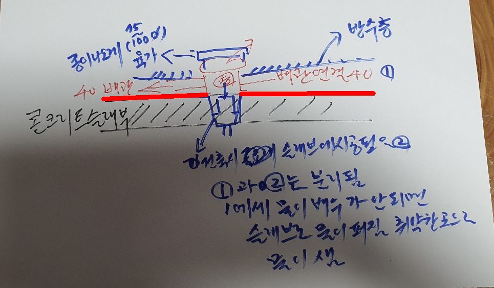 그러므로 현 솽황에 대해 공사 업체가 이 모든 것을 하자로 인정하고 조취를 취할 확률은 없습니다. 다만 그렇다고 하더라도 지금의 상황을 그냥 덮으면 또 다시 동일한 하자가 반복될 수 있기에.. 할 수만 있다면, 바닥을 다시 다 들어내고 방수층 부터 제대로 하시길 권해 드립니다.