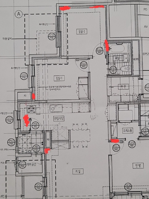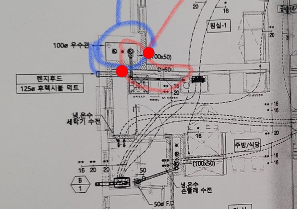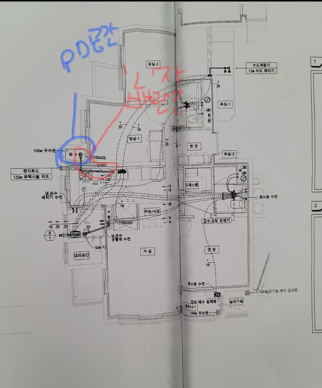 그리고 관리자님 의견이 분분하여 여쭤보는데요 첨부한 도면에서 표시한곳이 pd공간이라 하는데 우수관과 ' ㄴ ' 자 배관이 있습니다.
