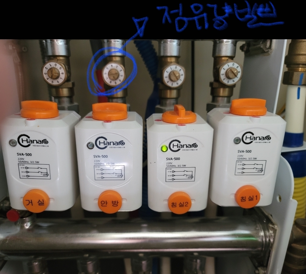 정유량 밸브 자체가 압손실이 많은 부속입니다. 정유량 밸브에서 압이 한번 걸러진다고 보시면 됩니다. 밸브에 숫자를 돌리게 되면 대부분 들러붙어있던 것은 떨어지게 됩니다. 아닌 경우도 있지만요. 정유량밸브 및 전동밸브는 보통 환수 쪽에 설치가 됩니다. 현재 설치되어 있는게 환수 쪽입니다.