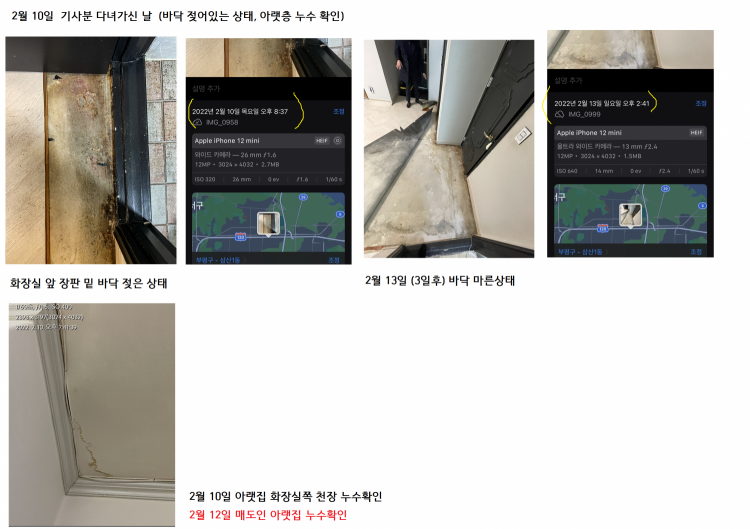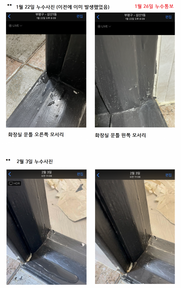 1/22 화장실 문틀에서 물이새는 누수를확인했고 (주로 세면대물을 틀면 며칠후에 물이 샘)
