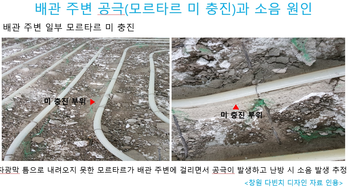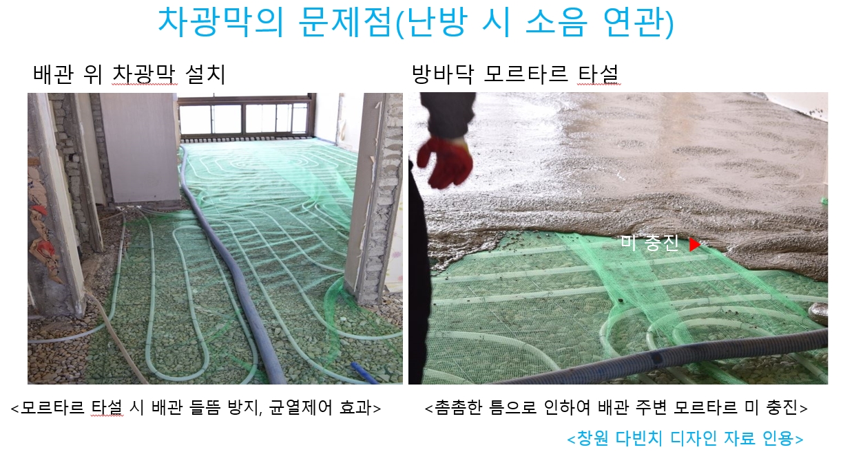 방바닥 소음의 대부분이 주택과 같은 소형 현장에서 발생하고 공동주택과 같은 현장에서는 발생하지 않거나 낮은 것은 이처럼 사용하는 자재와 관련 있다는 것입니다. 즉 무수축 모르타르를 사용하는 현장은 균열방지를 위한 별도 조치가 없음에 따라 난방배관 주변을 시멘트 모르타르가 밀실하게 애워싸고, 이런 시멘트 모르타르를 사용하지 않은 현장에서 '방진망' 사용 시 위와 같은 현상이 발생할 수 있다는 뜻입니다.