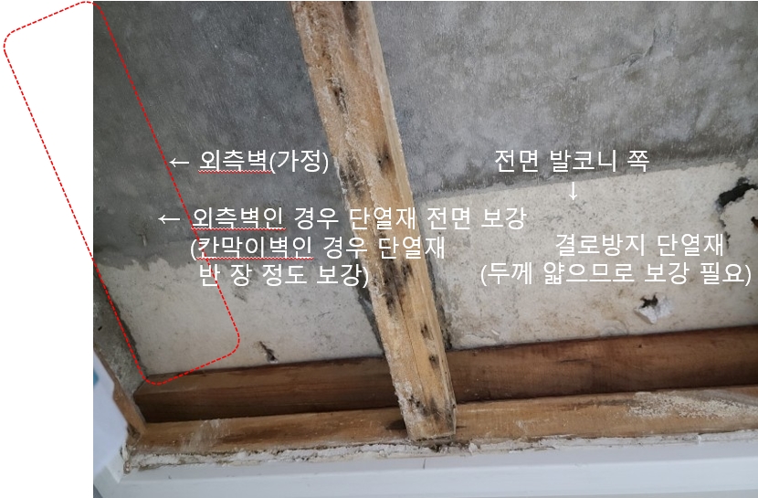 그러나 그쪽에 곰팡이가 발생하지 않았다면 그 벽은 이웃 세대와의 세대 칸막이벽일 것입니다. 이 때는 현재 전면 발코니 천장에 설치된 단열재 두께가 아마도 제 추측상 10mm일 것이므로 그 위에 20mm두께 단열재를 보강하십시오. 그리고 구석 즉, 옆집과 칸막이벽인 부위도 두께 30mm 폭 450mm 그리고 길이는 단열재 반 장인 900mm 정도 보강해 주십시오.