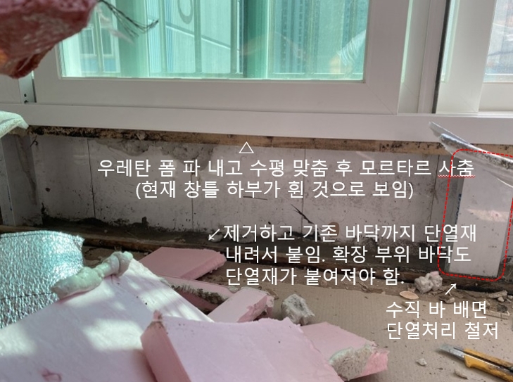 중요한 것은 벽과 바닥 모두 단열재가 끊임없이 연결되어야 하는데, 사진상으로는 외벽과 바닥이 면한 부위에 기초로 보이는 부위가 있습니다. 이로 인하여 바닥 단열재와 벽 단열재가 분리되어 열교가 되므로 이를 해체하여 바닥 단열재와 일체화 하십시오. 이렇게 말씀드림은 확장 시 바닥도 단열재 처리를 했다는 전제조건이 있습니다.