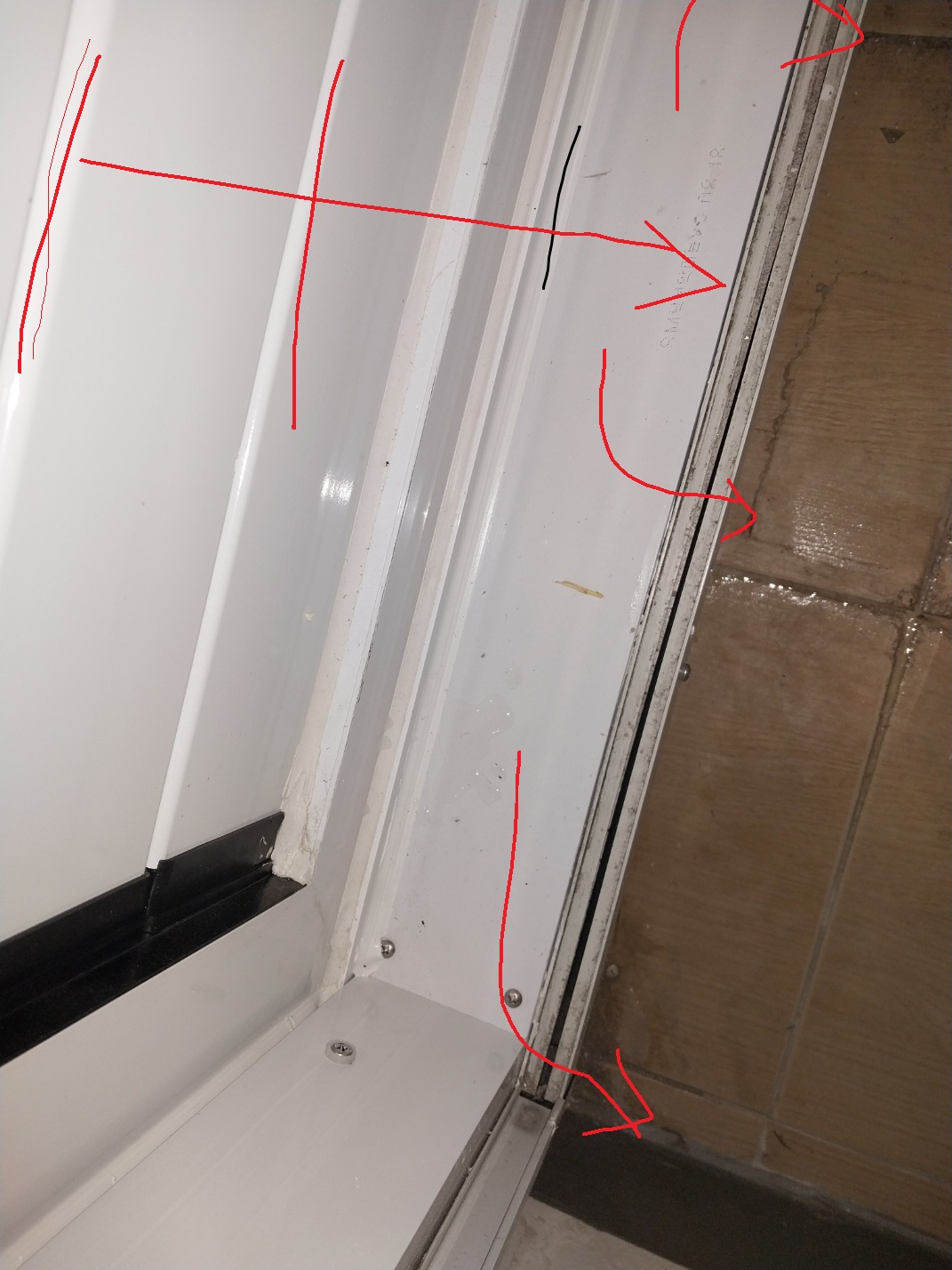 현재 상황은 루버창을 닫아도 비가 많이오면 루버창 가로 틈 사이로 물이 들어와 밑의 받침대에 물이 쌓이고 그 물이 루버창 하단부를 통해 누수되는 현상이 나타납니다(사진상 확인 가능)