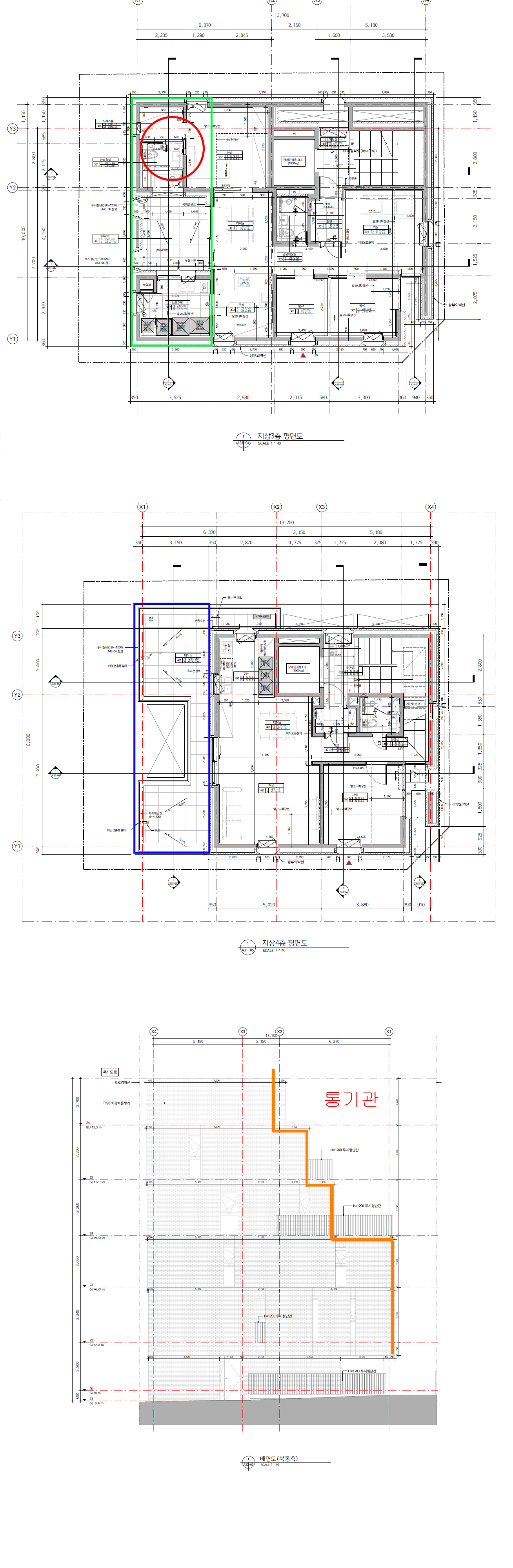 4. 통기관의 경로가.. 맨 아래 입면도에서는 수직의 직선으로 표현을 하셨는데, 배치도는 수평방향으로 이동이 있는 것으로 그려 놓으셨는데.. 이 부분을 죄송합니다만, 다시 표면을 해주시면 좋겠습니다.