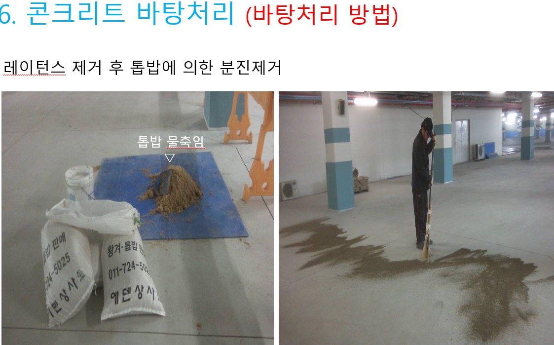 아래 사진은 오래 전 제가 수행했던 지자체 공사 시 바닥 연삭 및 분진 제거하는 장면으로, 연삭 후 물적신 톱밥을 바닥에 뿌리고 빗자루질 하여 바탕을 정리하는 과정입니다. 사진이 한꺼번에 두 개가 올라가지 않아서 나누었습니다.