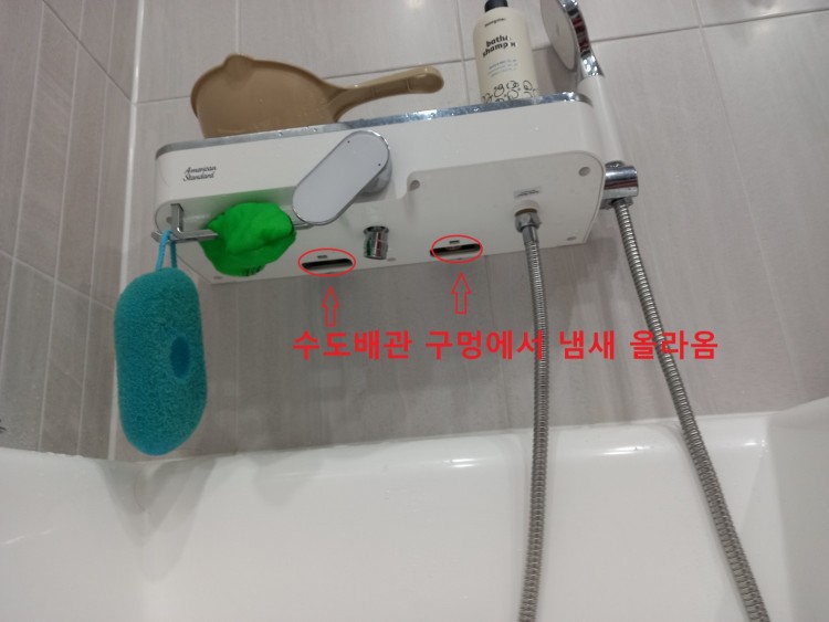찾아보니 욕조 및 욕조앞 수전 구멍에서 냄새가 올라오는 상황이며 환풍기를 켜면 욕조틈 및 수전 구멍에서 바람이 느껴지며 냄새도 더 많이 올라옵니다.