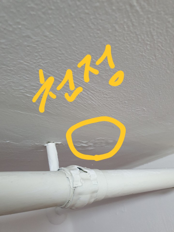 1. 천장 : 콘트리트에 페인트 마감, 페인트 들뜬 부분 10센티 옆으로 윗층 세탁실 배관있음
