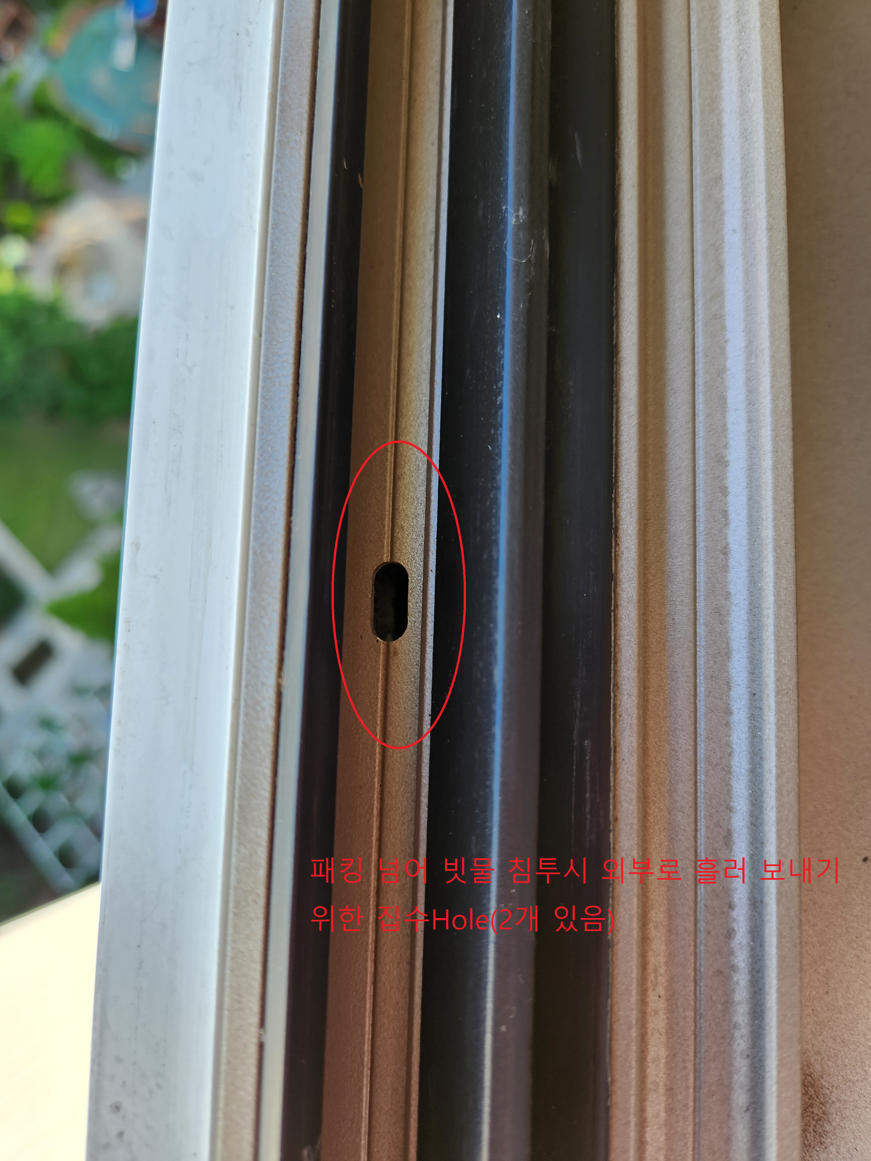 참고로 창틀 아래 부분의 빗물 침투시 집수홀 및 배수홀 사진 함께 송부드립니다.