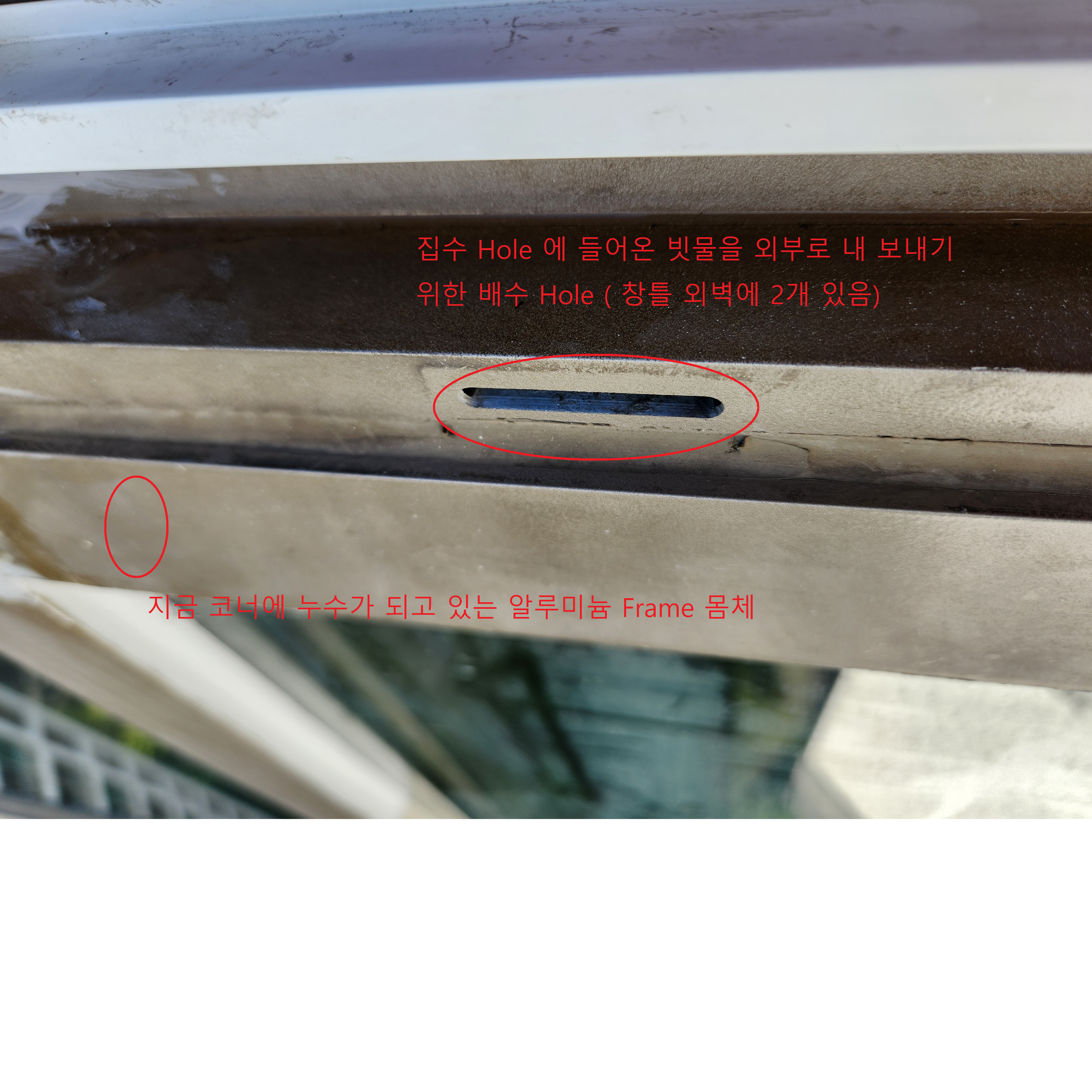 그 하부 알루미늄 Frame 에서 누수가 되는것으로 보아 "내부문제(외부와 접하는 창틀 모서리 부 분)" 에서 물이 나와 다시 하부 알루미늄 Frame으로 물이 흘러 갔다고 생각되지 않는지요 ?