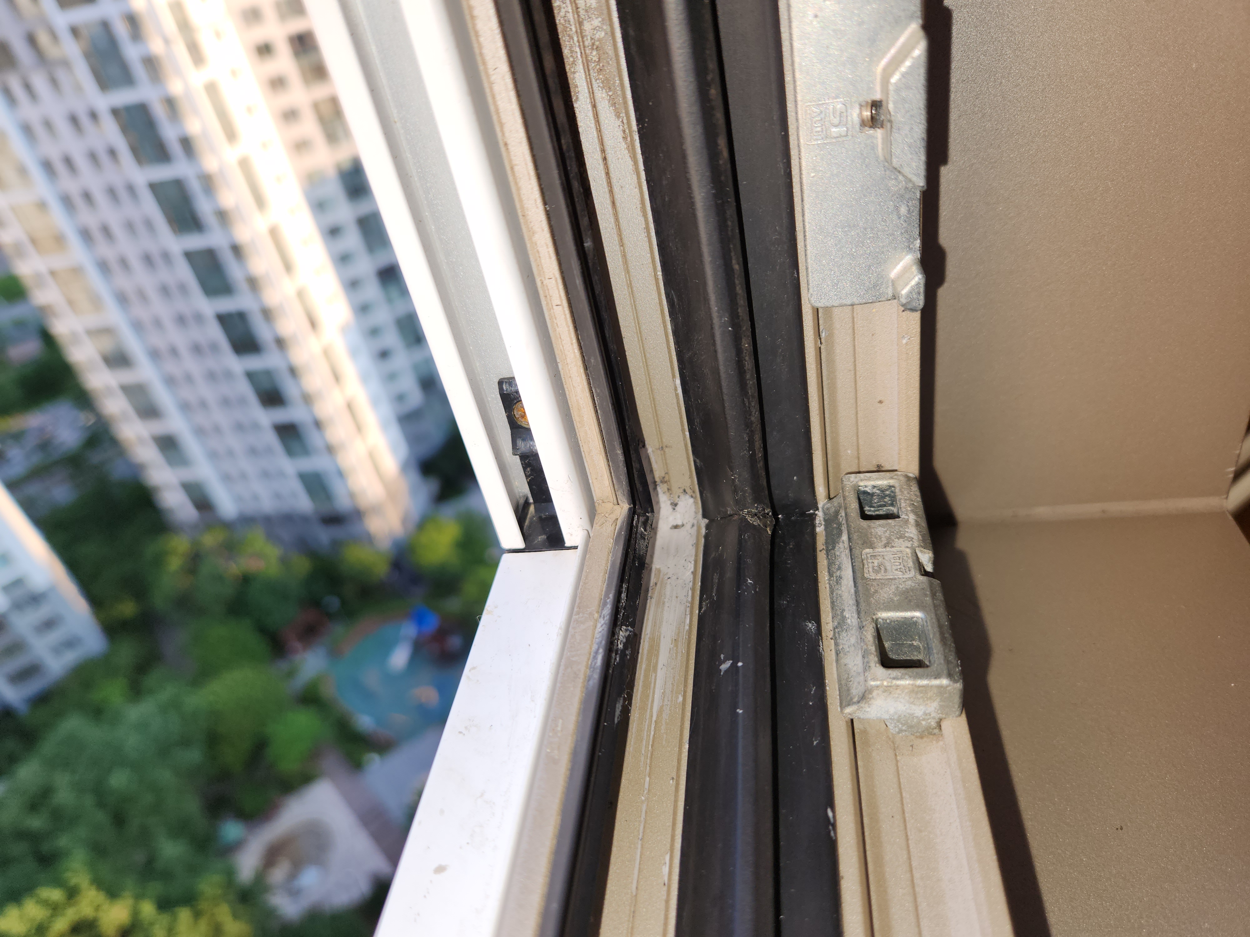 창호는 정상적으로 잘 닫히고 창문와 창틀 사이 고무패킹도 틈이 없이 서로 잘 밀착되어 빗물이 침투하기 어려워 보입니다.