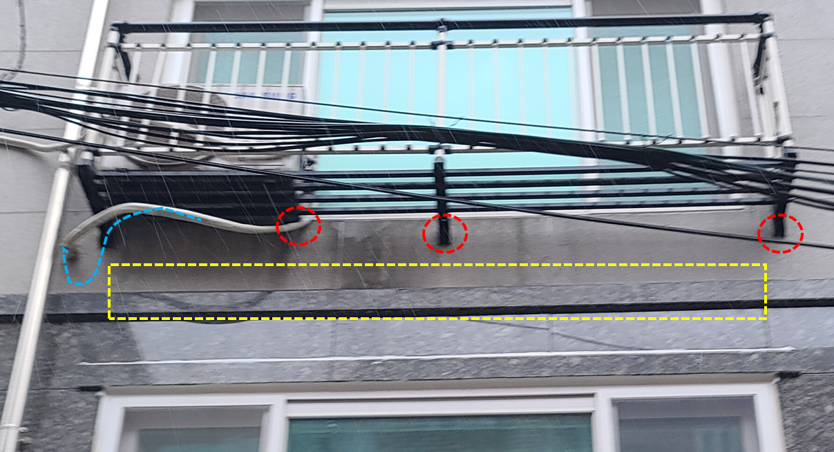 2. 실외기 난간이 외벽을 관통하는 모든 부위(붉은색)를 살펴 봐야 합니다.