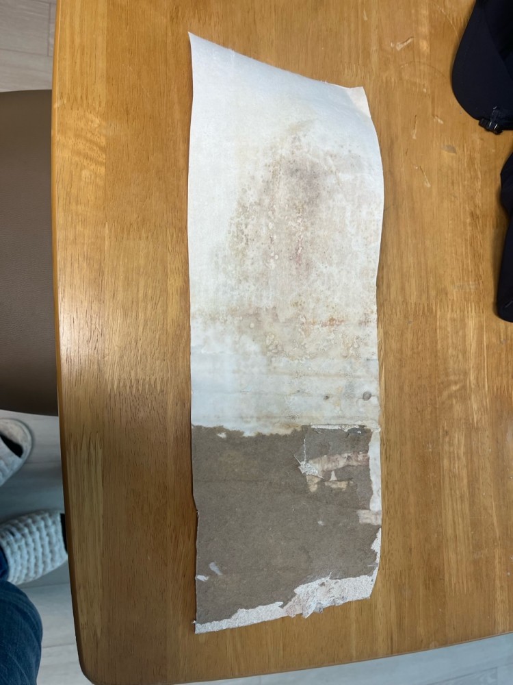 누수 흔적이 보여 벽지를 뜯었습니다. 벽지 겉면 사진은 아래와 같습니다.