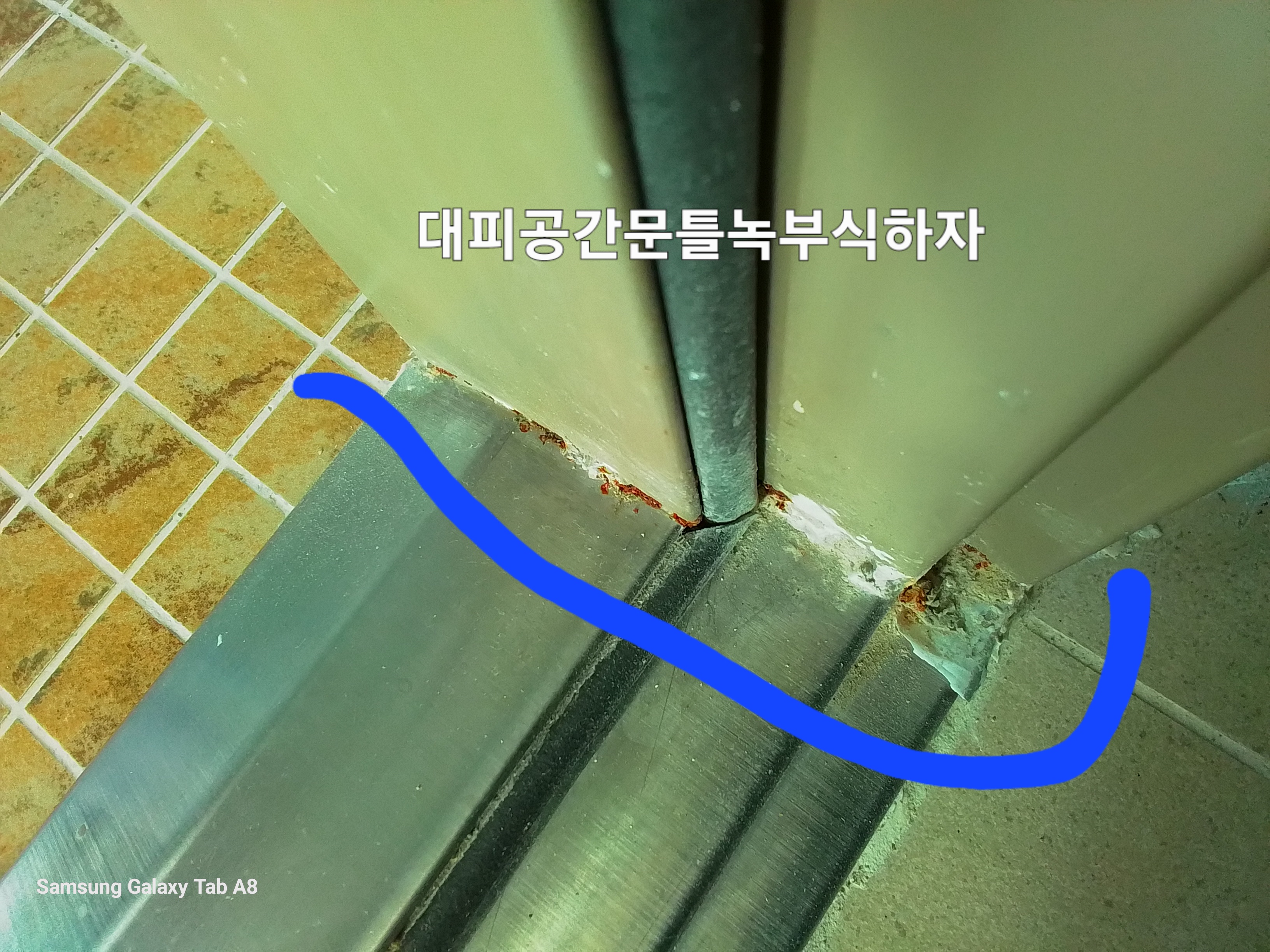 신축아파트 건설사가 지정한 입주기간은 끝났고 아직저는 입주전입니다. 청소하며 발견한건데 대피공간철문아래 녹부식을 발견했습니다. 6월달에 사전점검 때 대피공간 창문 미설치로 민원을 했고 그이후 하자에대한리스트를보니7월달에 작업한걸로 되어있습니다. 비도 많이 오고 그과정에서 진행되지 않았나 싶은생각이 듭니다.