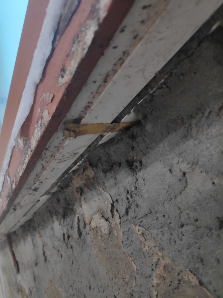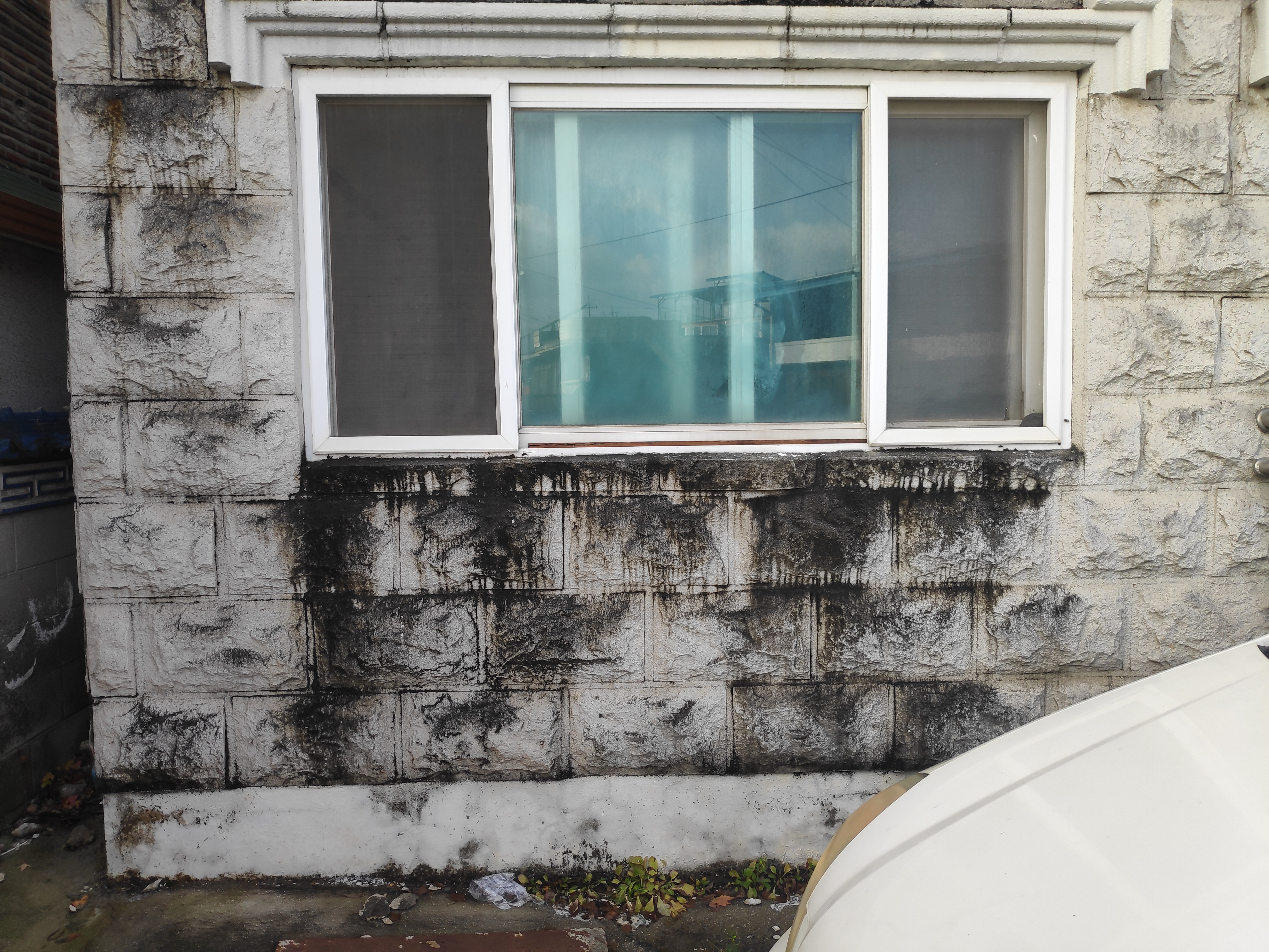 창틀 하부 벽에 곰팡이가 발생한 것으로 보입니다.