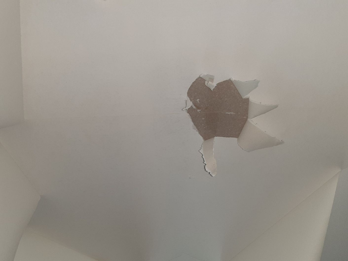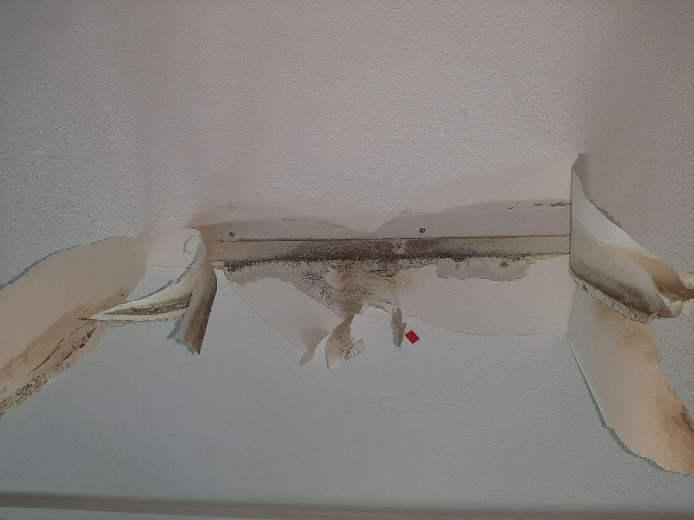 다만 이 확인은 건조가 끝난 후에 판단을 해야 합니다. 건조 과정 중에 변형이 있을 수 있기 때문입니다. 그리고 건조 속도를 올리려면 벽지를 제거해야 합니다. 비닐계 벽지라서 습기 증발이 빠르지 않거든요.