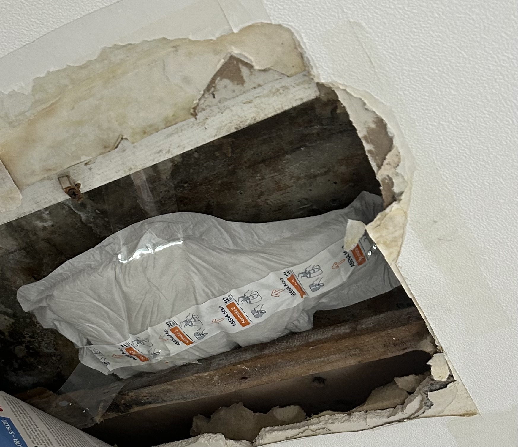 7.     안방 천정에 구멍을 낸지 13일째인 202418일 여전히 물은 떨어지고 구멍안 석고보드와 콘크리트에 곰팡이가 너무 많이 피게 되어 아파트 설비팀장에게 우리집 상황이 점점 나빠지고 있다 어떻게 되어 가냐고 묻자 설비사장이 못 고치겠다고 갔다고 합니다. 그러면서 제가 알아서  설비업체를 부르라고 하더군요.