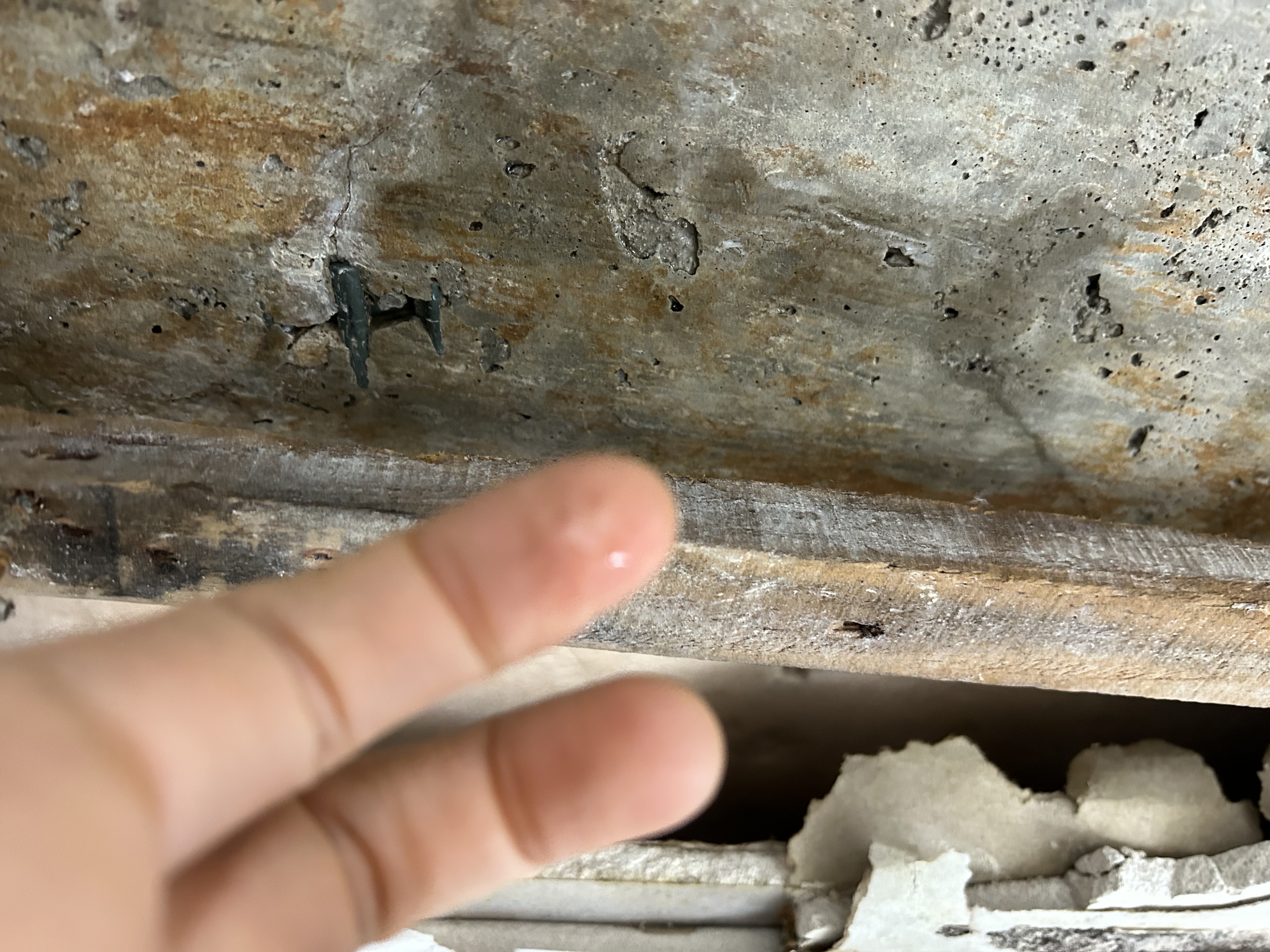 11.  정리하면 겨울철 한파 후 날씨가 포근해지는 무렵 저희집 안방 외벽 천장 크랙 부위에서 누수가 있습니다. 오래된 누수로 백화현상과 철근 주변 누수자국은 이미 누렇게 변해 있습니다, 밝혀진 원인은 윗집세대의 외벽 쪽 내단열재가 방안의 공기와 열교현상이 일어나 차가운 외벽(구조체)에서 결로가 일어나고 한파에 그 결로가 얼고 날이 풀리면 물로 변해 저희집으로 떨어지는 현상이 반복되는 중입니다.