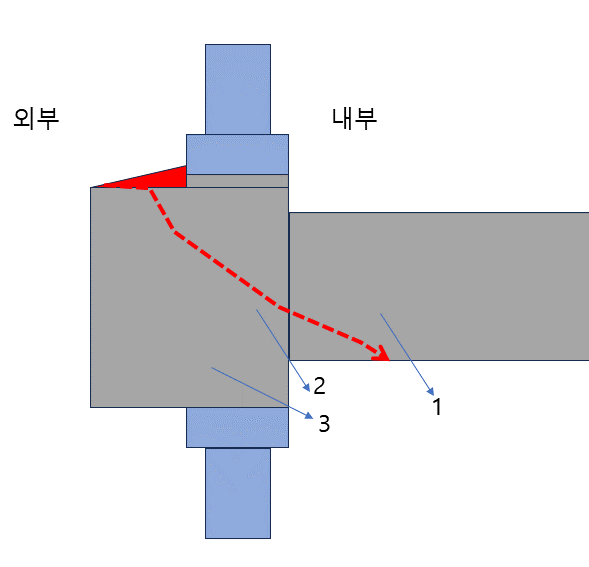 근본적인 해결은 이 삼각형 몰탈 부위를 철거한 후에 구조체 균열을 보수하고, 다시 삼각형을 만드는 것인데.. 실제 실행은 어려울 수 있습니다.