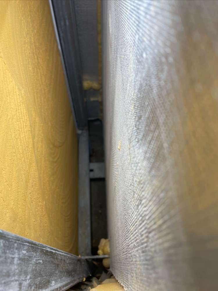 사진에서 우측에 보이는 은박면이 벽체에 붙은 단열재이고 좌측 노란면이 외장재에 붙은 단열재 인데 깍여서 은박면이 없는 모습니다.