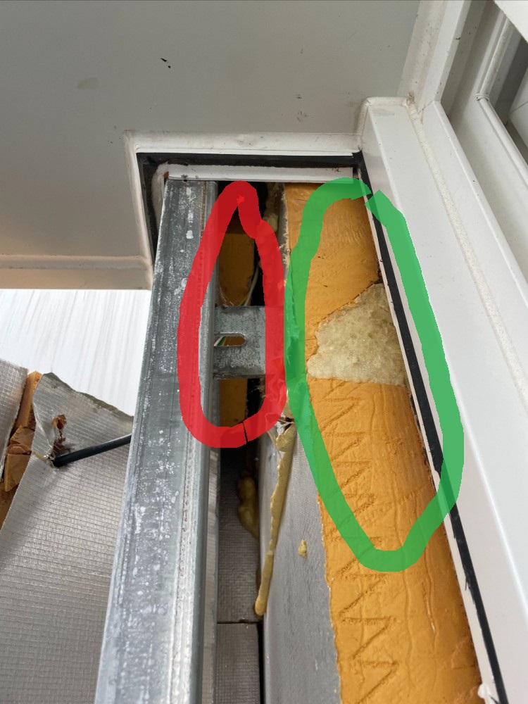 사진상 빨간 동그라미가 분리한 외장판 윗 외장판에 붙은 단열재 밑면 모습이고 초록색 동그라미는 벽체에 붙은 단열재의 옆면이 드러나있는 모습입니다. 외장판에 붙은 단열재는 외장판 단열재끼리 대략 7~8센치 떨어져 있으므로 윗면 밑면이 다 외기에 은박면 없이 드러나 있는 상태입니다.