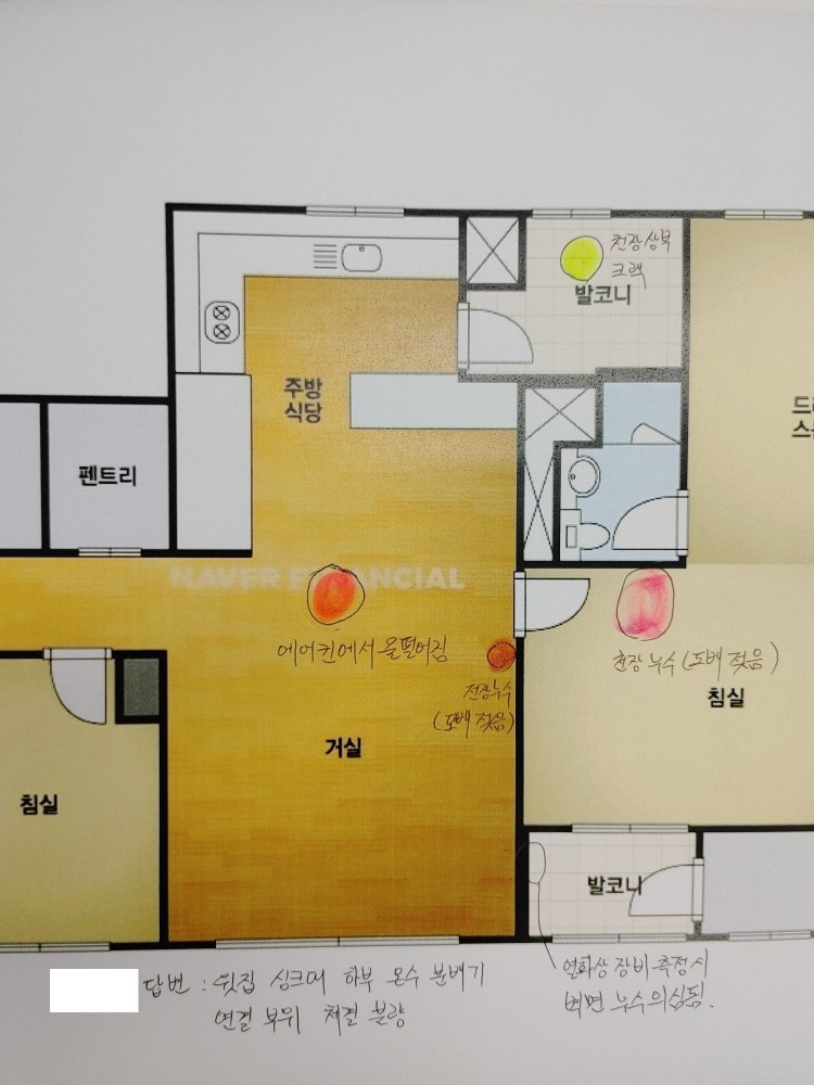 아파트 사전점검시 거실 및 안방 천장에서 누수가 발생하였습니다 원인은 윗집 싱크대하부 온수분배기 연결부위 체결불량으로 답변받았습니다