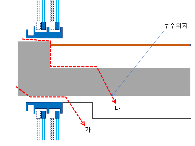 "가"를 통한 누수는 창문 바로 앞에 누수의 흔적이 생겨야 하지만, 지금은 "나"를 통한 누수일 확률이 높습니다.