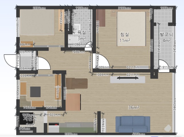 4. 거실과 복도,부엌만 셀프레벨링하고 방과는 단차를 둬서 문 바닥 틀을 설치한다(또는 방으로 경사지게 만든다)