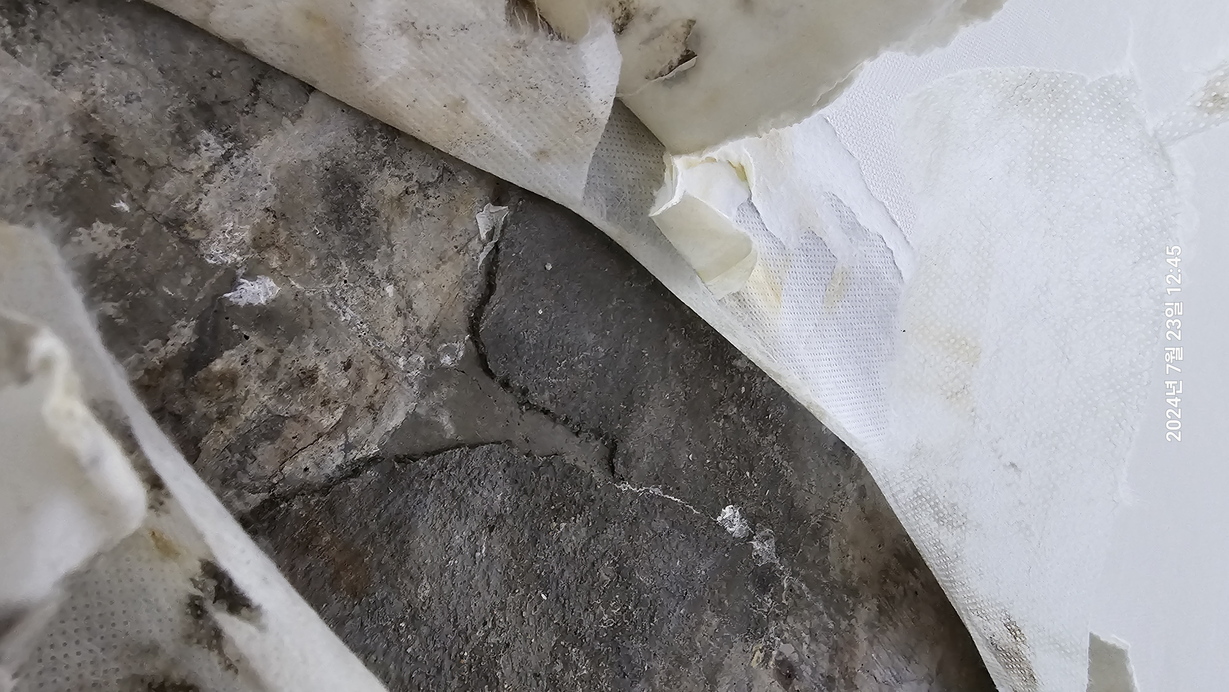 그래서 휴지를 대봤는데 대략 두 지점에서 물이 나오고 있습니다. (하단 사진 참고)