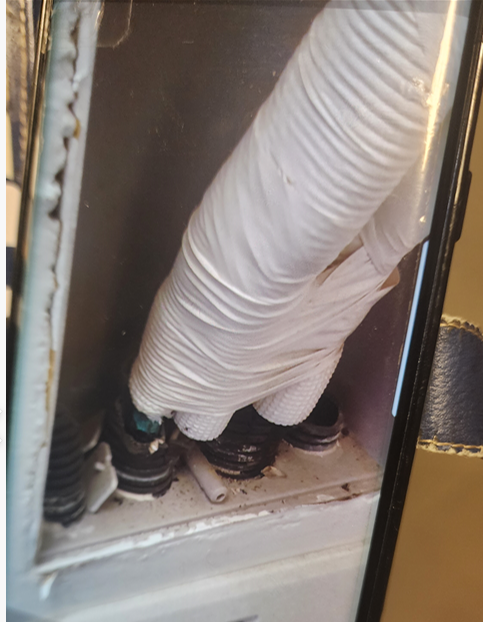 즉 에어컨 냉매배관이 이 검정색 공배관 속을 통과한 부분에 단열재가 감싸졌는지 확인해 보시라 한 것이었고요. 그렇지 않다면, 단열재를 감싸고도 그 배관을 통과할 수 있는지의 여부를 보시라는 의미였습니다.