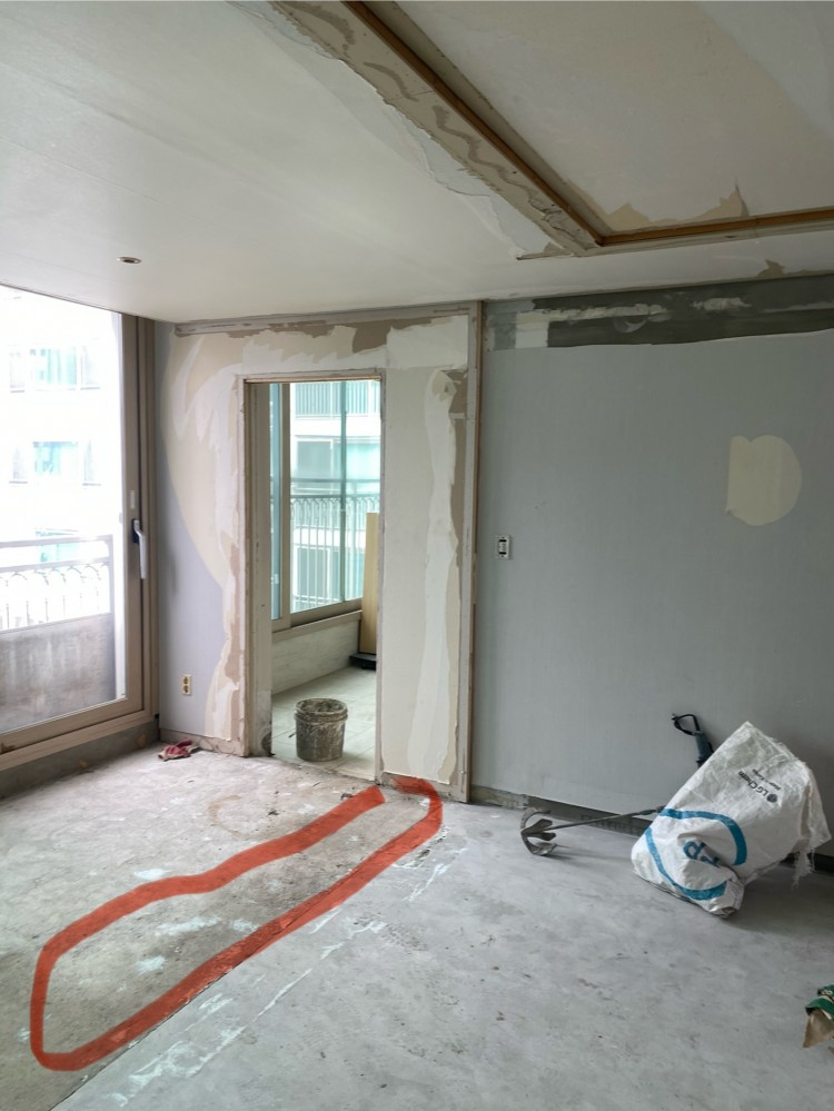 그 전부터 그 부분이 마루상태가 좋지않았고 바루 철거했더니 습기가 있어요 거실 확장부 경계부분이 그런데 아랫집에서 누수로 연락온적은 없었다고 합니다