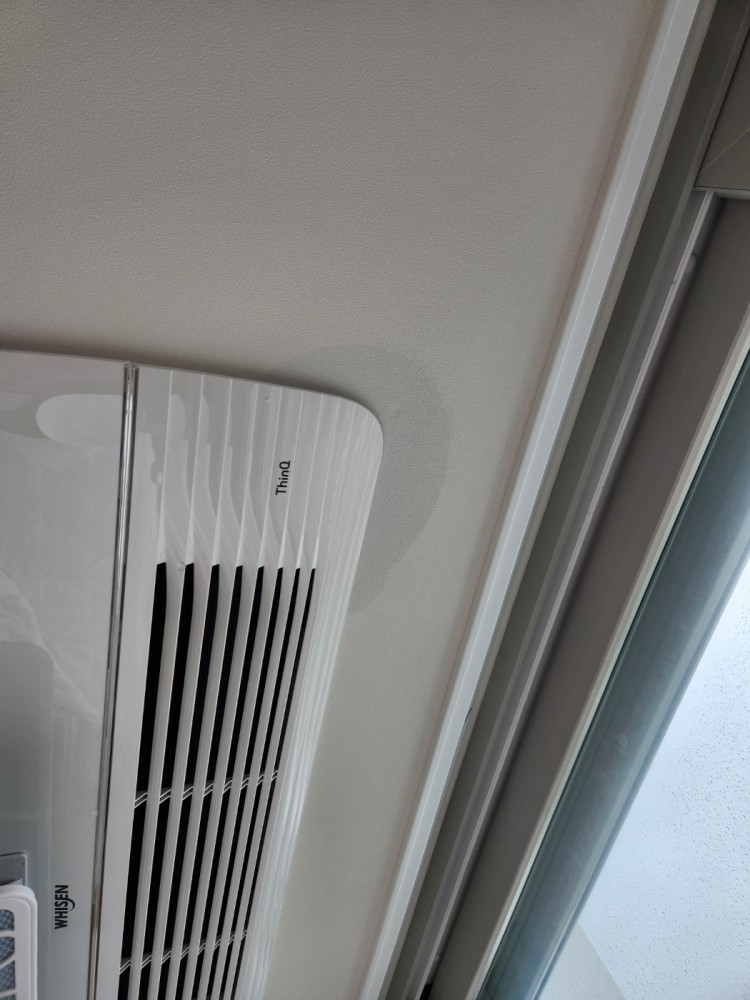 올 여름 장마 폭우때 안방 시스템 에어컨 자리 천장에서 물이 새기 시작하였고 에어컨 떼보니 천장 크랙 확인 및 누수 확인하였습니다.
