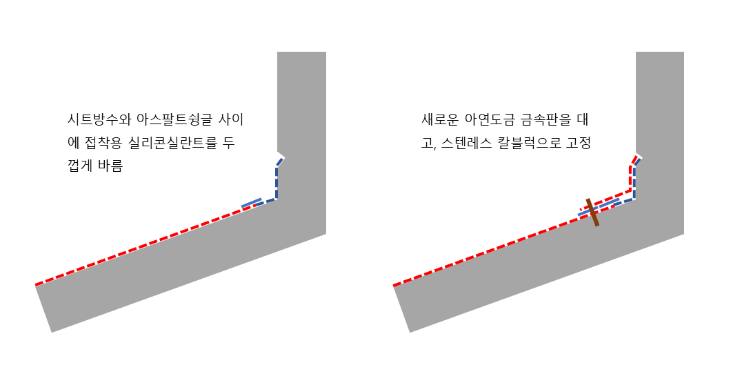 이렇게 아스팔트 슁글과 금속이 만나는 부위는 항상 고질적 문제를 일으키는데, 지금 처럼 실리콘코킹으로 해결될 것 같지만, 수명이 1년을 채 가지는 못하는 문제가 있습니다.