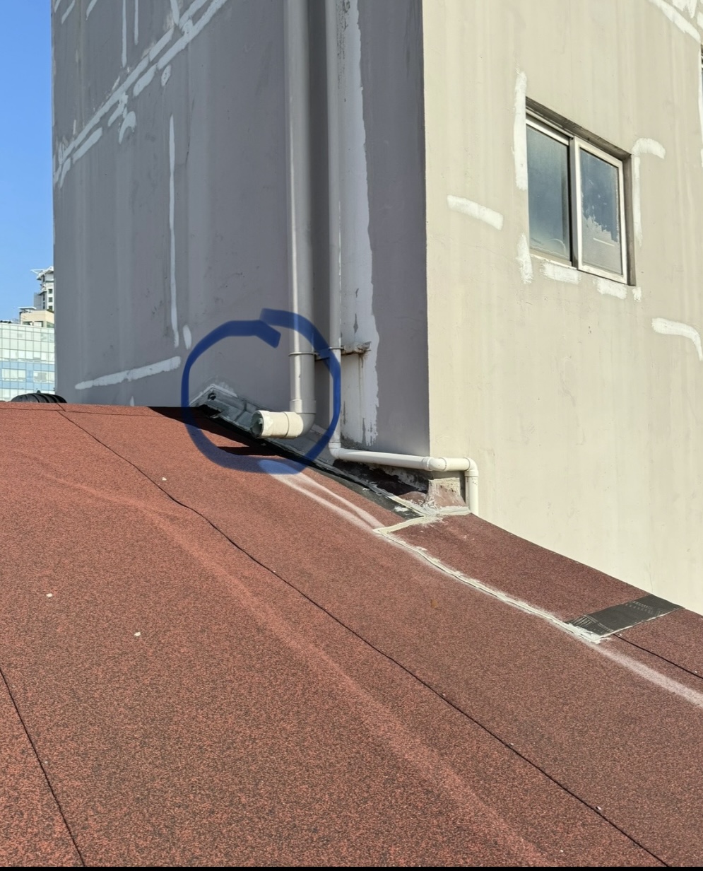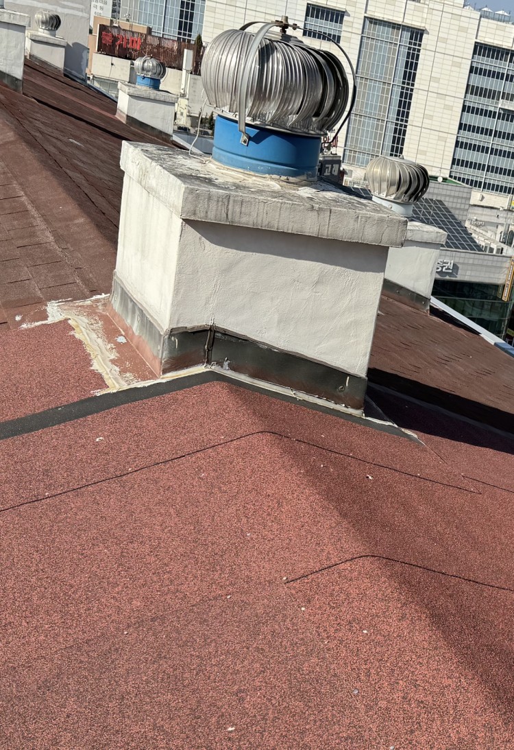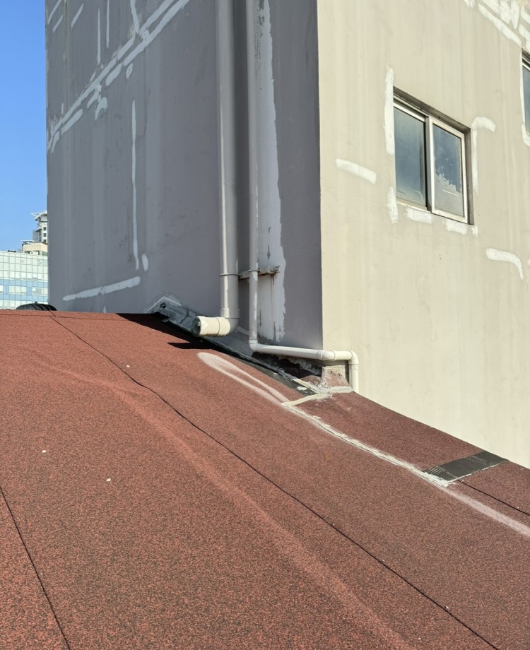 기존 지붕 위에 아스팔트슁글을 덮으신 것인데.. 이 슁그 자체는 문제가 없어 보입니다. 그저 위에 말씀드린 것 처럼.. 수직벽과 지붕이 만나는 부위를 따라 누수가 생긴다고 추정됩니다.