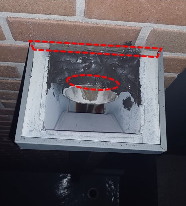 상자홈통을 꽂아 넣은 지붕에서 나오는 배관의 아래 부분에도 손을 깊게 집어넣어 실리콘으로 막아주어야 합니다. 사진을 보면 위에만 실리콘을 발랐는데, 여기는 아무리 발라도 아무 의미가 없습니다.