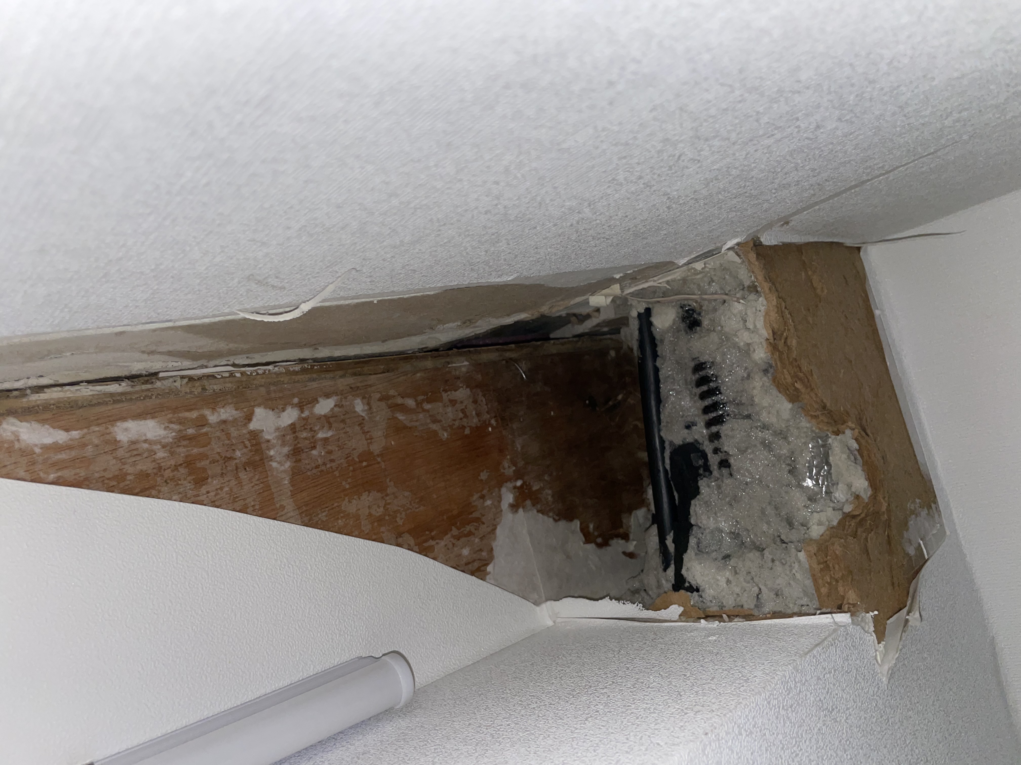 4. 에어컨 및 인테리어 사장님께 연락 , 천장 일부분을 뜯어서 확인. 공간 협소 하여 잘 안보이지만 에어컨 관 20센치 위로 나무 막대? 같은 곳에 물방울이 2~3방울 맺혀 있음 (작년에 영상을 찍어 뒀는데 화질이 않좋아서 삭제함), 관리실에서 다시 와서 확인 후 이건 무조건 에어컨 결로 누수다라고 하고감. 윗집 누수 일수도 있으니 확인해 달라하였으나 윗집에 물어 보니 그쪽으로 가는 배관이 없어서 누수는 없다라고 했다함