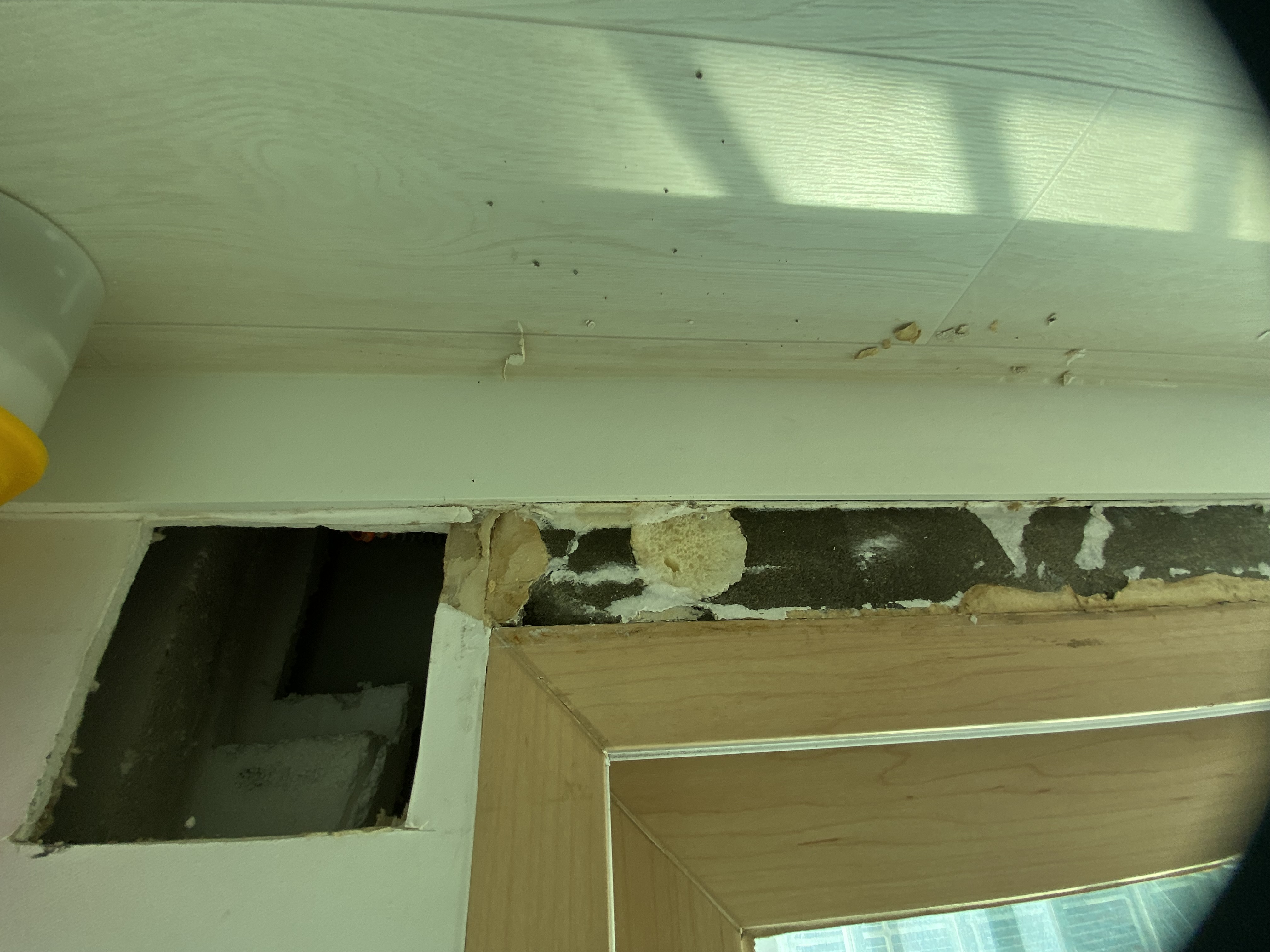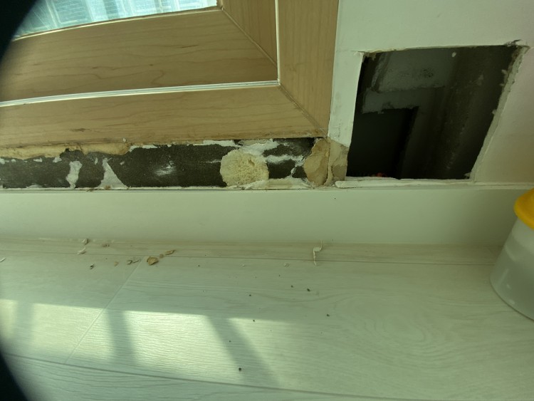 2. 아래 사진처럼 오른쪽 샷시 옆 석고보드 부분을 조금 잘라서 비오는날 또는 평소에 위 아래 옆에서 물이 새어나오는지 확인해 봤는데 그 안쪽은 비오는 날에도 물기가 없었습니다