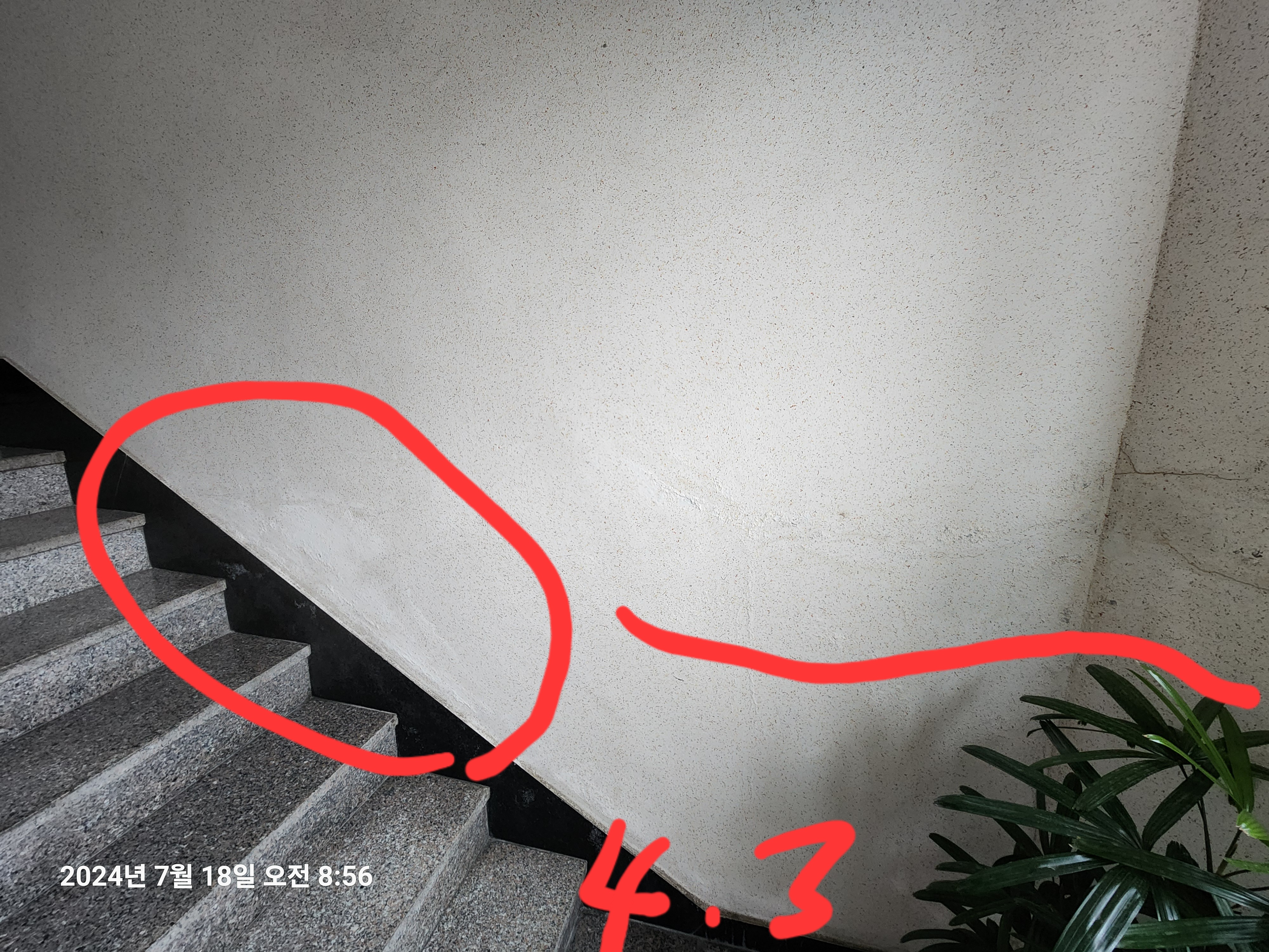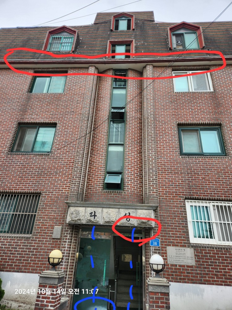 2. 옥상 계단실 한면, 4층 세대는 아스팔트 싱글로 되어 있고 3층부터는 빨간 벽돌로 되어 있습니다. 4층 아스팔트 슁글이 끝나는 처마 벽체에 아주 굵고 긴 가로 크렉이 가 있습니다. 내부 계단 벽에도 4층 아래부터 지하층까지 누수의 흔적이 있고 실제로 비오는 날 물이 떨어지고는 합니다. 다만 일직선은 아닙니다. 그리고 현관 캐노피에서는 비 오지 않는 날에도 물방울이 떨어집니다(1층 외벽 수직 하단부와 동일한 증상입니다). 급기야 2,3년 전에 하단 석판이 철근과 함께 내려 앉아 금속재제로 교체했으나 물떨어짐은 여전하여 현관 유리면과 바닥면에 백화현상이 있습니다.